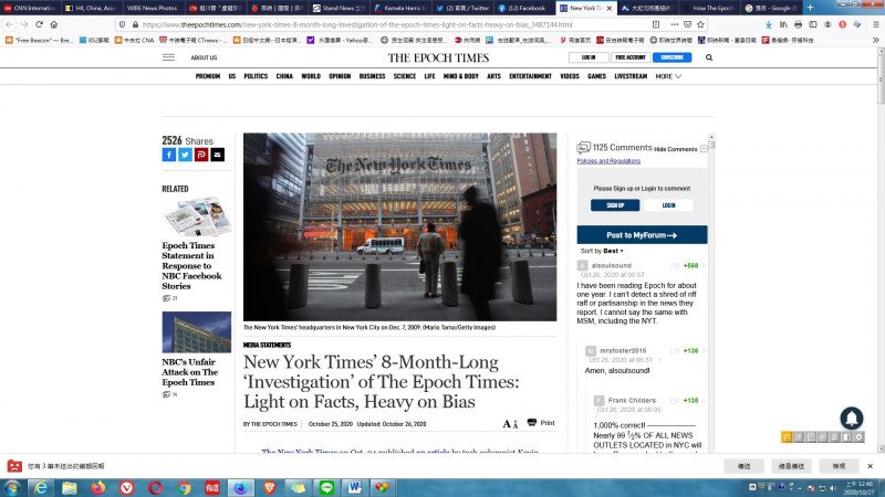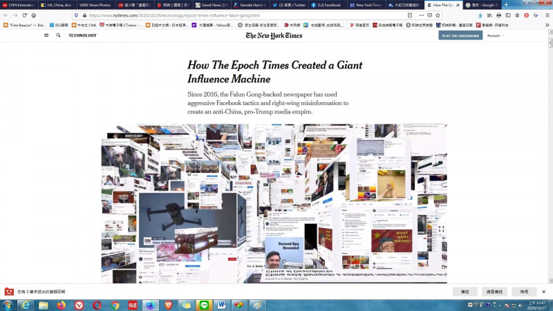 〔國際新聞中心/綜合報導〕美國總統大選進入倒數階段,向來被視為親自由派的美國「紐約時報」24日發表長篇調查報導,指控具法輪功背景的「大紀元時報」(The Epoch Times),藉由積極的社群媒體戰略,散播對尋求連任的川普有利的聳動陰謀論,已成為「散播虛假資訊的重要右翼媒體」。大紀元時報隨即反批紐約時報充滿偏見、斷章取義,「正中中共下懷」。
