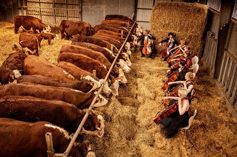 可是紐約時報的文章是真實的報導,今年4月25日(禮拜日)下午在丹麥 Copenhagen 郊外 Lund 區 Stevns小鎮,有8位大提琴家演奏二場音樂會,一場是奏給喜愛音樂的人,另一場是奏給農場的一批牛聽。這場音樂會主辦人是英國大提琴家 Jacob Shaw,他曾經在世界各地(包括紐約市 Carnegie Hall)獨奏大提琴,後來定居在 Stevns小鎮開辦 Scandinavian Cello School,專心教琴。他在日本演奏的時候,聽日本有傳言說他們有名的 Wagyu (和牛),養牛的農夫給牠們按摩,喝啤酒,又給牠們聽古典音樂;他得到靈感,所以來到丹麥時,給當地養牛農夫 Haugaards夫婦建議嚐試「對牛彈琴」。
