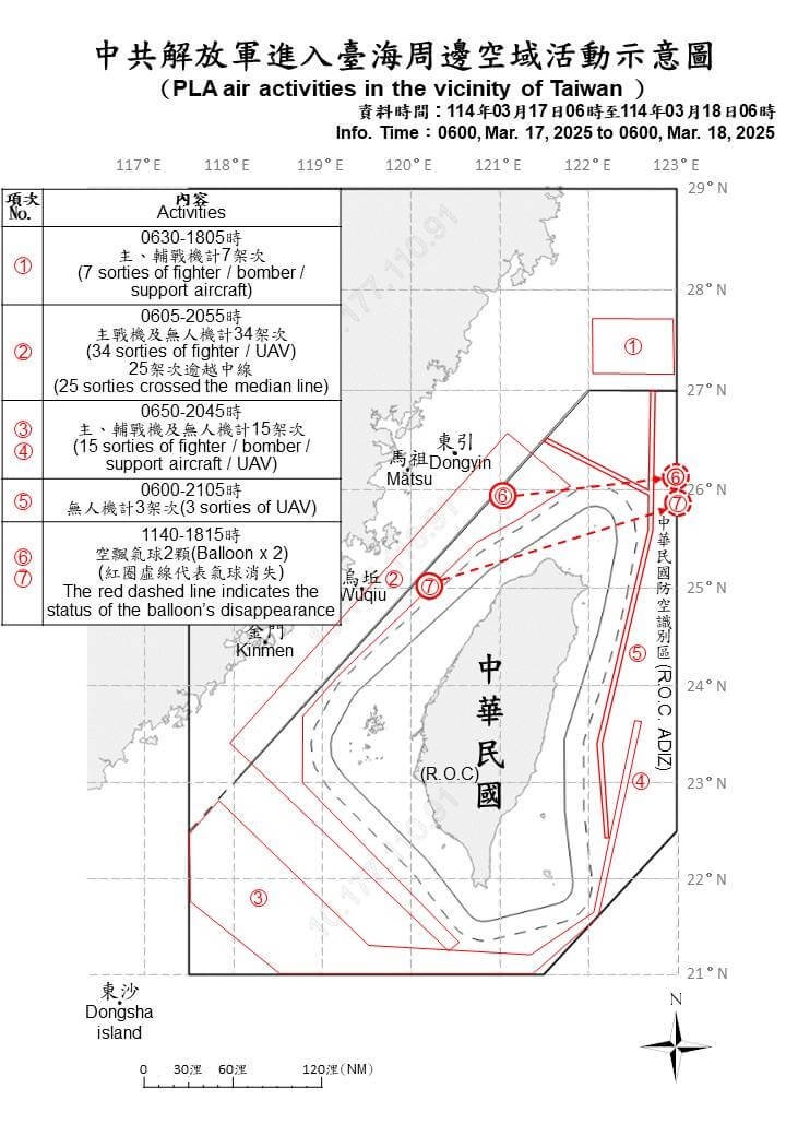 根據國防部今天公布的「中共解放軍進入台海周邊空域活動示意圖」,昨天上午6時5分至昨天晚間8時55分,在台灣海峽空域偵獲中共34架次主戰機及無人機,其中25架次逾越中線。
