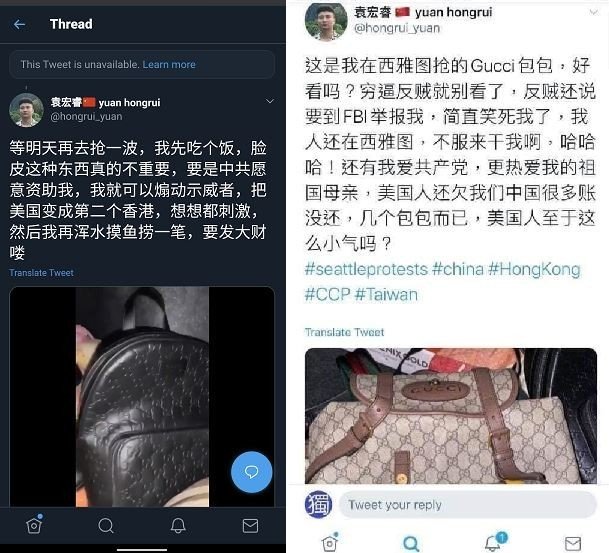 在推特自稱居住在華盛頓州西雅圖市的25歲中國留學生「袁宏睿」,2日在推特PO出自己洗劫商店得來的名牌精品照,大言不慚的說:「在西雅圖搶的GUCCI包包,好看嗎?」 他甚至嗆網友「可以去FBI舉發,我人就在西雅圖,不服來找我啊,哈哈哈」,還狂妄地說:「美國人還欠我們中國很多帳沒還!幾個包包而已,美國人幹嘛那麼小器?」還得意這是熱愛祖國的表現。
