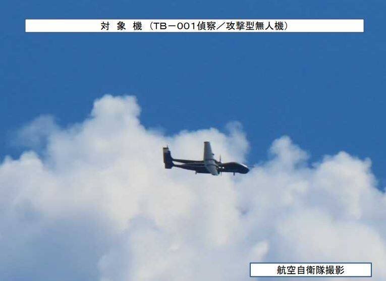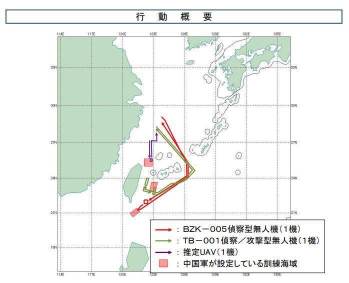 日防衛省統合幕僚監部指出,昨日有3架無人機在台周邊飛行。分別為一架BZK-005偵查型無人機,路線從沖繩、宮古島間水域穿越至台灣南方海域的軍演水域再原路折返;另一為一架TB-001偵查/攻擊型無人機,同樣穿越沖繩、宮古島間水域,飛抵台灣東部海域軍演地後返航;三為一架型號未知的無人飛行器,在東北部海域與上述兩架無人機出發地點之間來回飛行。