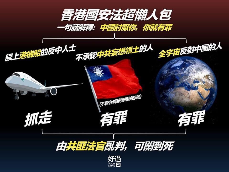 同時如果你搭乘國泰航空、九龍航空、(新增麗星郵輪),不小心在航程內寫了篇文、發了封信、聯絡了某人,只要他認定這些行為違反國安法,對不起中國政府也可以立即逮捕你。