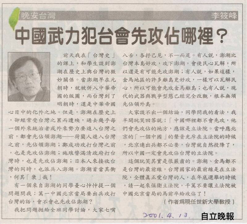 這篇名為「中國武力犯台會先攻佔哪裡?」的剪報照片張貼在李筱峰的個人部落格,原本是2001年4月發表在《自立晚報》的專欄文章。