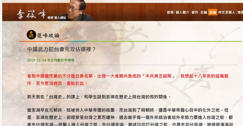 李筱峰在文章中提及,他上課時問學生,若中國武力犯台會從哪裡開始?他先提及歷史上中華帝國欲併吞台灣都是從澎湖開始,荷蘭、明鄭、清朝施琅都是從澎湖開始。學生們無不認為,攻澎湖或金馬離島最容易,可瓦解民心,但也有學生認為,現代武器先進,應該會先攻本島。