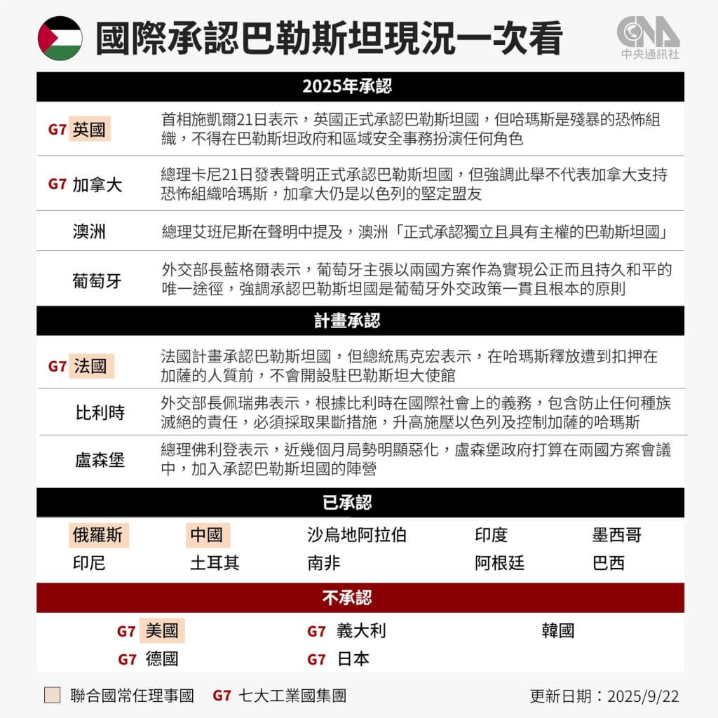 以色列批評英澳加承認巴勒斯坦權力機構「是對聖戰分子哈馬斯的獎勵」。