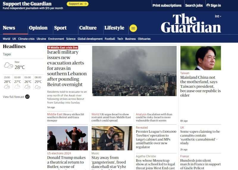 (中央社台北6日綜合外電報導)總統賴清德昨天晚間在113年國慶晚會致詞時,拋出中華人民共和國絕不可能成為中華民國人民「祖國」的論述,引發國際媒體關注,並登上英國媒體「衛報」網站首頁。