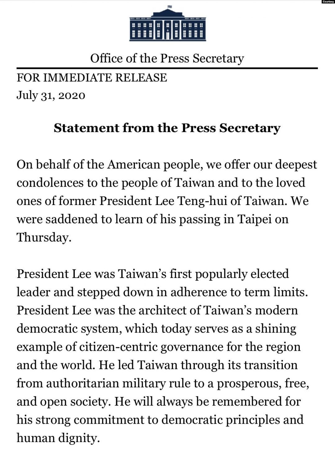 We offer our deepest condolences to the people of Taiwan and the loved ones of former President Lee Teng-hui, the first popularly elected leader of #Taiwan. “Mr. Democracy” was a champion for freedom and the architect of Taiwan’s free and open society.