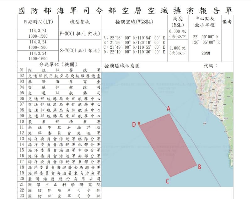 國防部6日發布海軍艦隊指揮部民國114年第1季實施對專案操演空域申請實彈射擊通報單,根據海軍操演報告單,操演日期為3月24日,區域是屏東西南外海,高度在6000呎以下。自由時報報導,管制區域「剛好」鎖定目前中國權宜輪漂航滯留區。