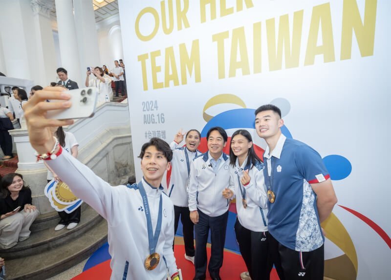 總統賴清德16日下午接見「2024年第33屆巴黎奧林匹克運動會代表團」,林郁婷(左1)與陳念琴(左2)、賴總統(中)、吳詩儀(右2)、王齊麟(右1)在「時尚拍照區」自拍。(總統府提供)