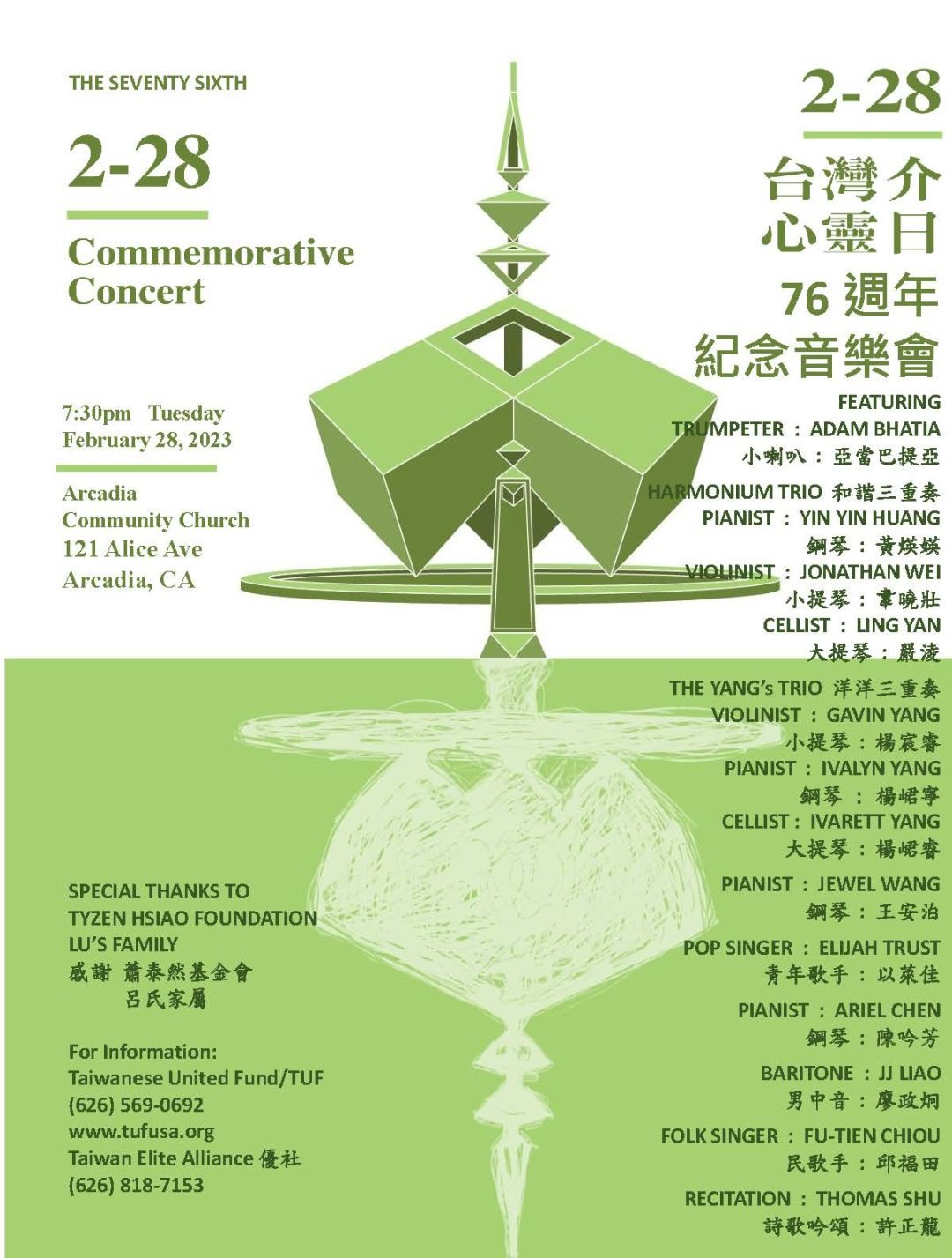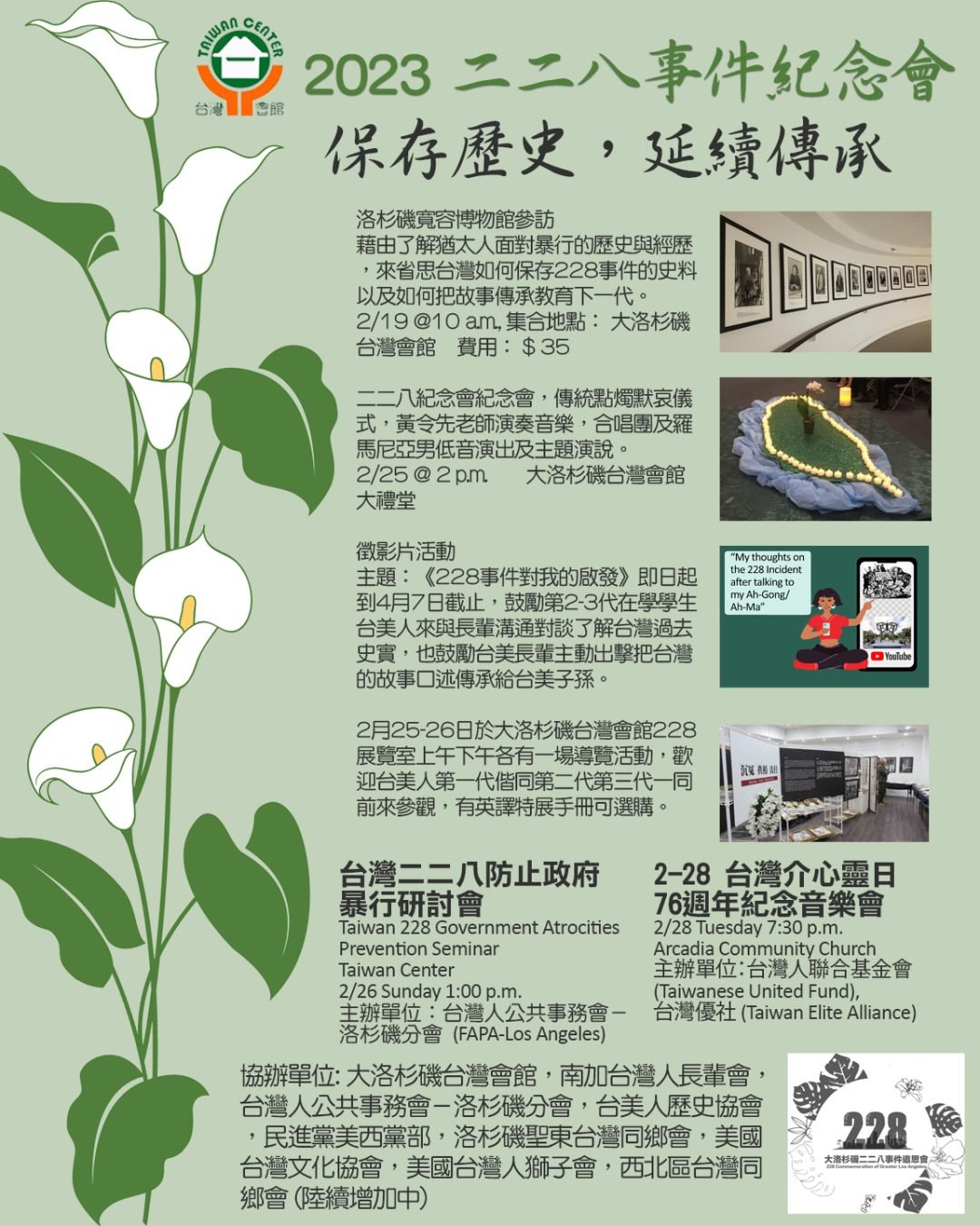 2月25日下午2點(禮拜六)台灣會館將舉行二二八紀念會,活動有傳統點燭默哀儀式,黃令先老師演奏音樂,以立合唱團及羅馬尼亞男低音演唱台語歌曲及主題演說。為鼓勵年輕家庭來認識二二八,紀念會同時安排「兒童認識二二八台灣工作坊」延續對第三代的台美歷史教育,在紀念會同時段舉辦兒童認識台灣歷史工作坊,邀請會館台美小姐用中英文雙語講解台灣歷史故事兒童繪本及製作簡單手工藝來讓台美人下一代親近台灣。年輕的父母可以安心去參加紀念會。2月 25-26日於大洛杉磯台灣會館二二八展覽室上午下午各有一場導覽活動,安排專人英文導覽,歡迎台美人第一代偕同第二代第三代一同前來參觀,有英譯特展手冊可選購,透過導覽與配合手冊可更清楚了解台灣歷史。