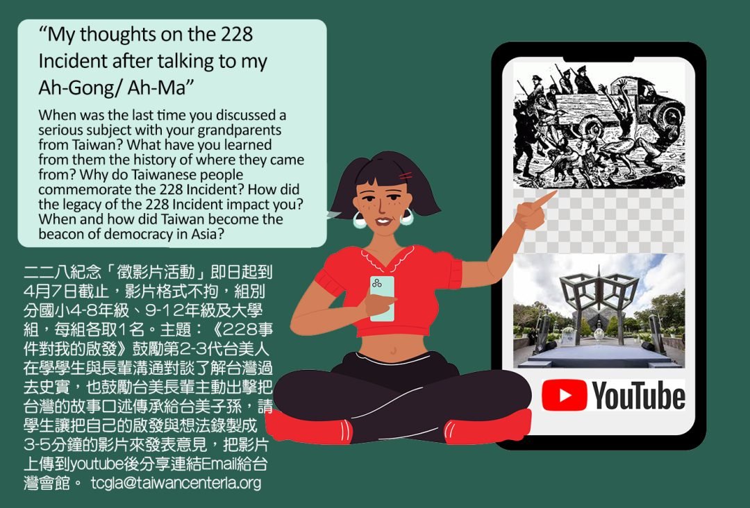今年台灣會館將舉辦徵影片活動,主題是:《228事件對我的啟發》鼓勵第2-3代台美人在學學生與長輩溝通對談,了解台灣過去史實,也鼓勵台美長輩主動出擊把台灣的故事口述傳承給台美子孫,請學生讓把自己的啟發與想法錄製成3-5分鐘的影片來發表意見,把影片上傳到youtube 後分享連結Email給台灣會館tcgla@taiwancenterla.org。徵影片活動即日起到4月7日截止,影片格式不拘,組別分國小4-8年級、9-12年級及大學組,每組各取1名。