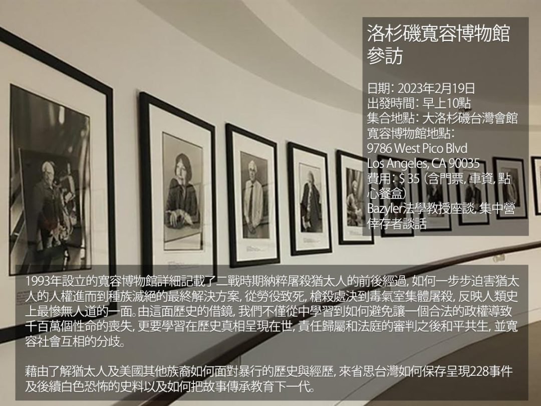 請鄉親攜帶家人在2月19日(星期日)早上十點到台灣會館集合準時出發,費用為每人$35 (含門票,車資,點心餐盒)。當天將有著名學者Michael Bazyler教授以法律的觀點發表談話,寬容博物館並將安排納粹大屠殺的猶太人倖存者的對談。