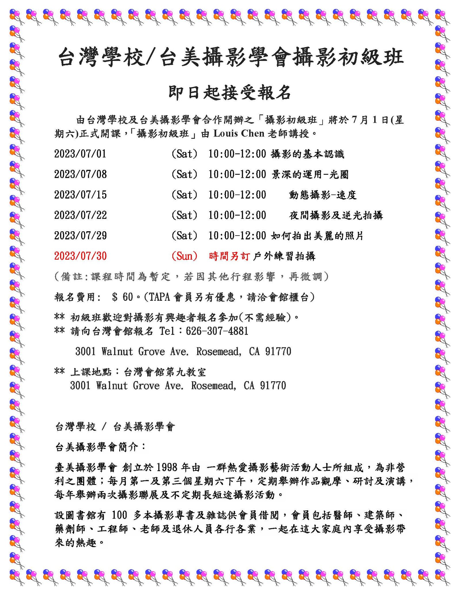 台美人台加人大洛杉磯台灣會館大洛杉磯台灣會館台灣學校/台美攝影學會攝影初級班 招生中 June 17, 2023 敬請支持‧歡迎訂閱本報newsletter 本報24/7隨時更新 歡迎定閱newsletter