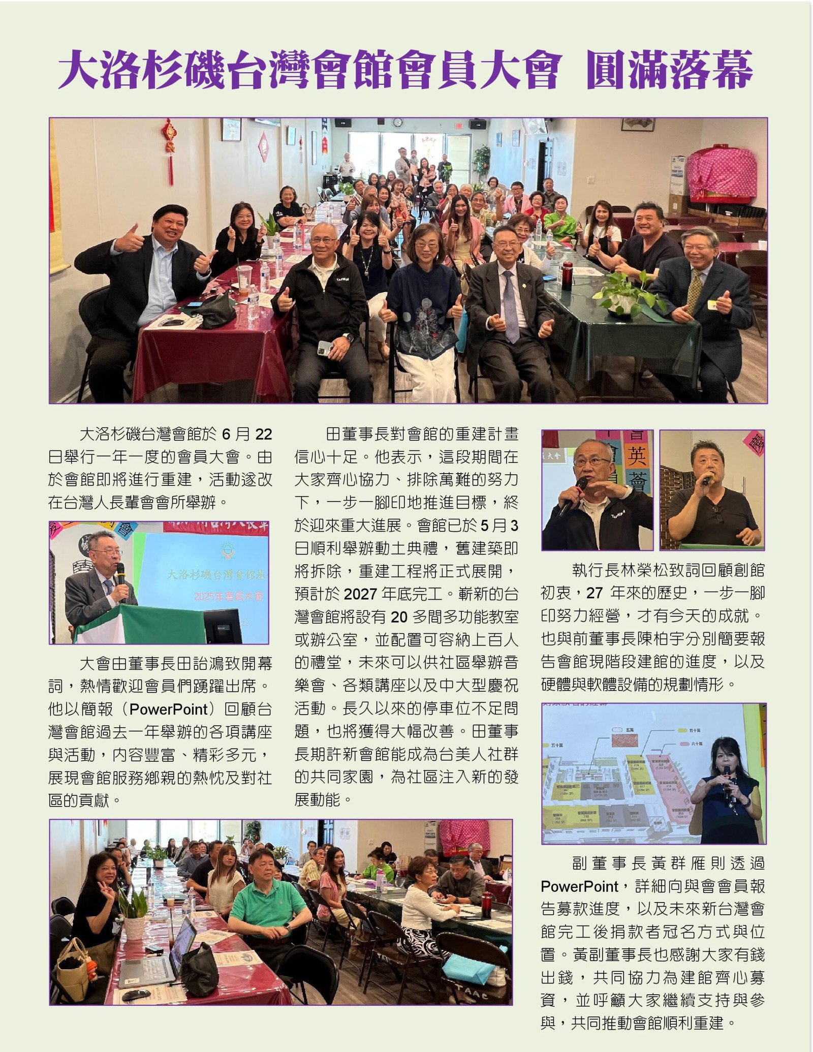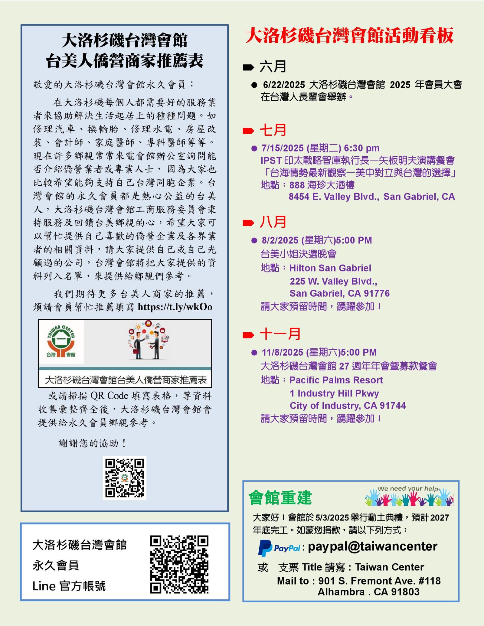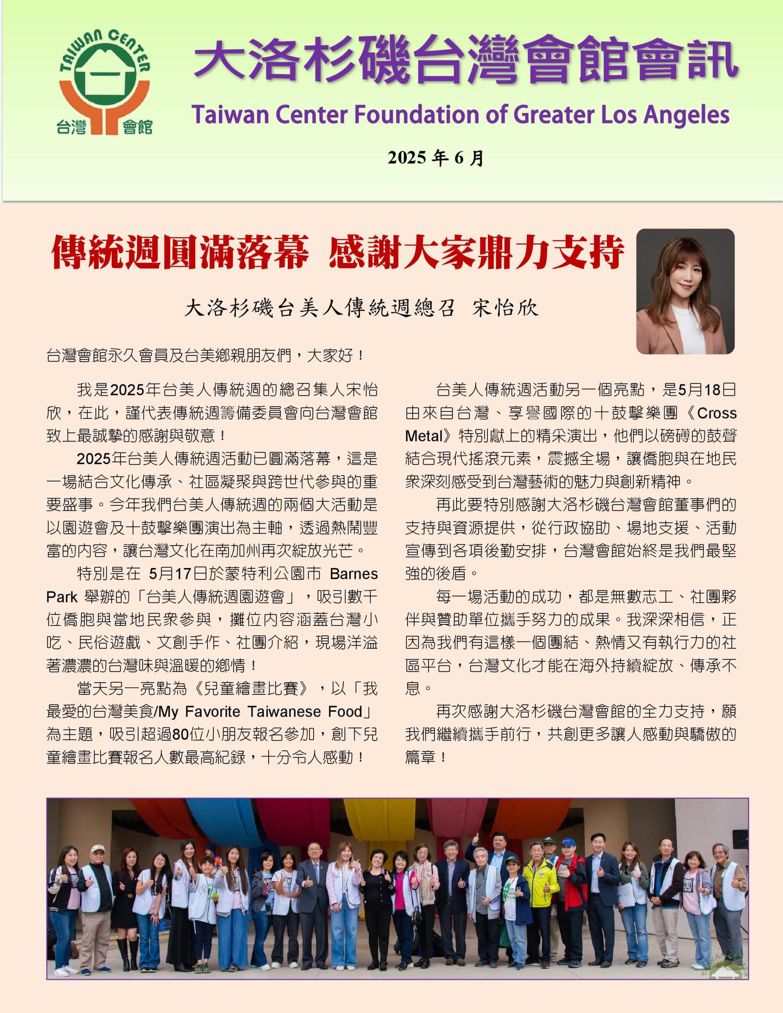 美國頭條台美人台加人大洛杉磯台灣會館台灣會館會訊大洛杉磯台灣會館2025年6月份會訊 July 2, 2025 敬請支持‧歡迎訂閱本報newsletter2025-07-02 大洛杉磯台灣會館 本報24/7隨時更新 歡迎定閱newsletter