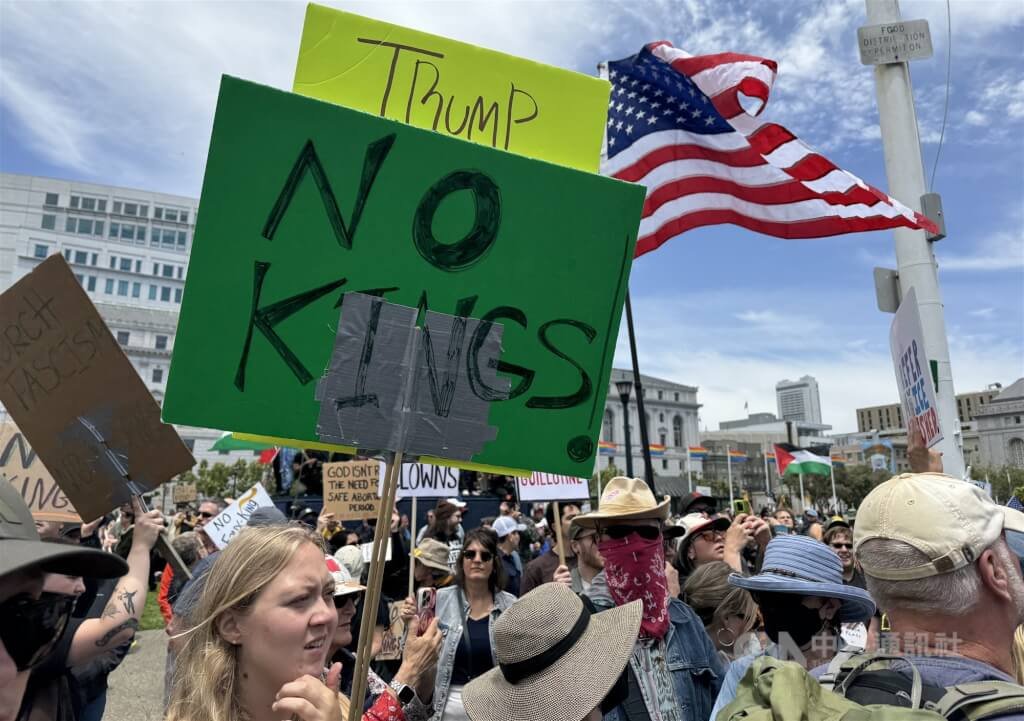 抗議,舊金山示威群眾高舉「沒有國王」等標語。中央社記者張欣瑜舊金山攝-114年6月15日.jpg)