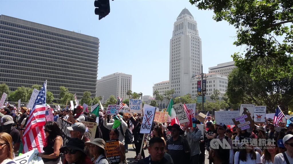 (中央社華盛頓14日綜合外電報導)79歲生日這天,美國總統川普今天在華盛頓揭開他夢寐以求的閱兵式序幕。與此同時,全美「無王日」示威如火如荼進行當中,數以萬計抗議者走上街頭,稱川普為「獨裁者」。