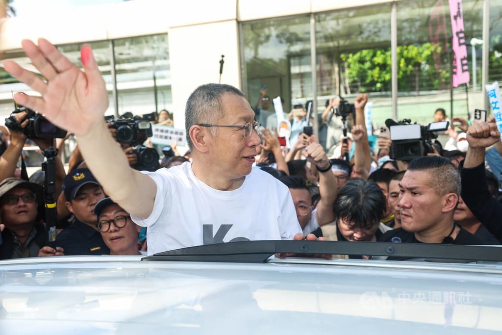 前台北市長柯文哲涉及京華城等案聲請具保停押,獲裁定新台幣7000萬元交保。圖為8日下午柯文哲(前左)步出北院,準備搭車離去時向支持者揮手致意。前右為 網紅「館長」陳之漢。中央社記者吳家昇攝 114年9月8日