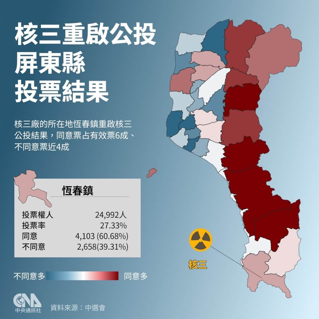 屏東縣投票率為31%,同意票為12萬720票,不同意9萬460票,僅有7個鄉的不同意票大於同意票;至於核三所在地恆春鎮同意票為4103票、占比60.69%,大於不同意2658票,投票率為27.33%。