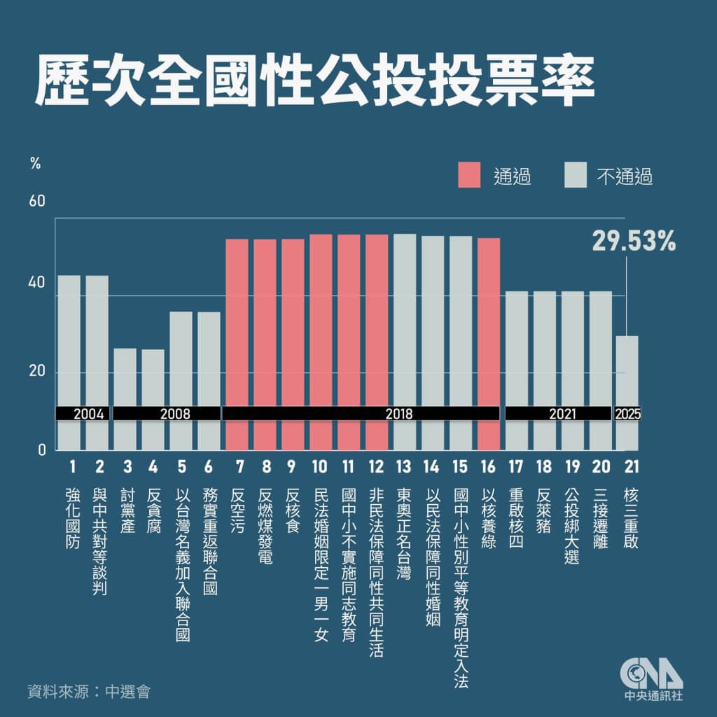 (中央社記者高華謙台北23日電)核三重啟公投同意票未達投票權人總數1/4門檻而未通過,這次投票率為29.53%,創公投投票史上第3低,同意票占比達74.17%,所有縣市的同意票都大於不同意票,核三所在地屏東縣恆春鎮同意票比率也突破6成。