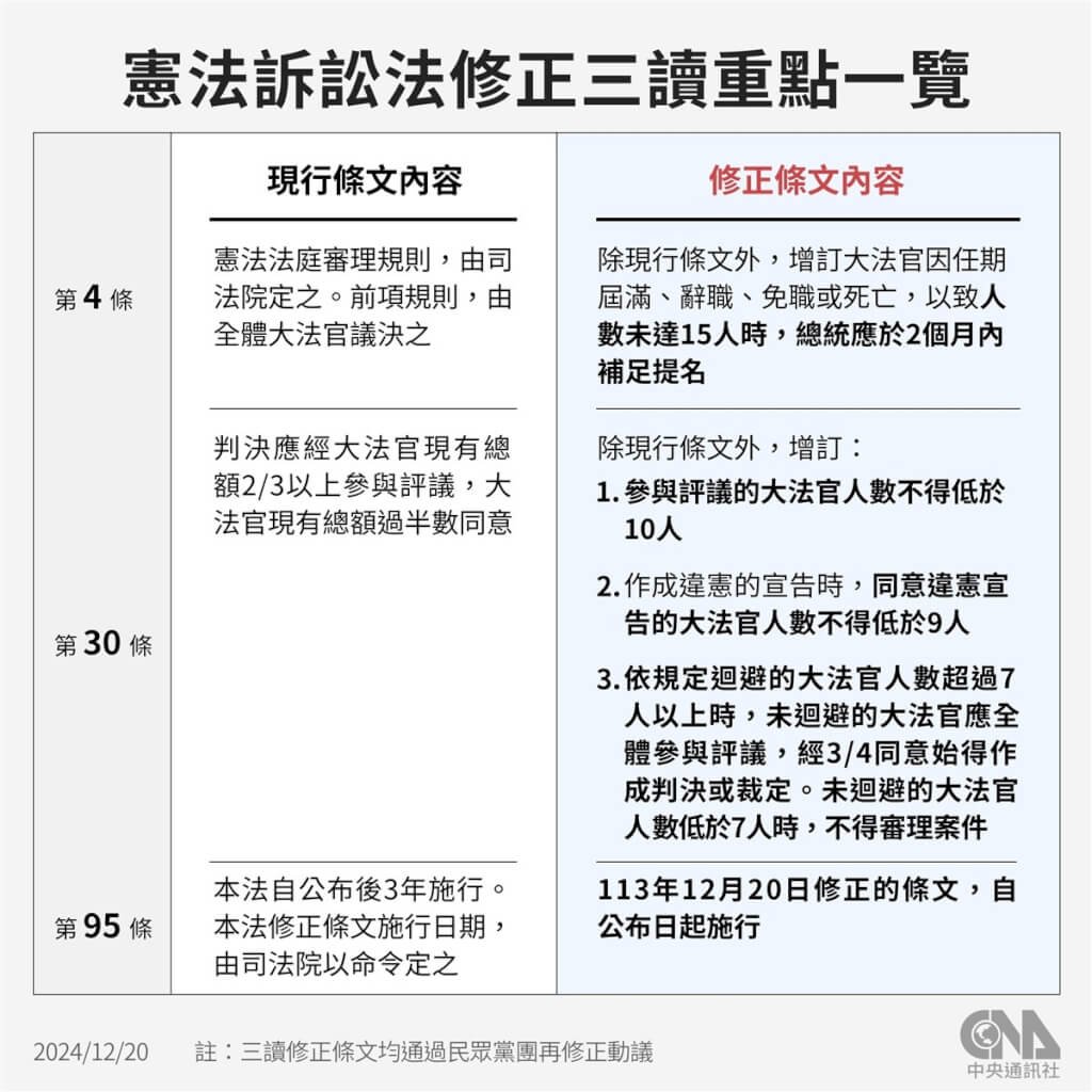 立法院會去年12月20日三讀修正通過憲法訴訟法部分條文,規定大法官未達15人時,總統應於2個月內補足提名。另外,參與評議的大法官人數不得低於10人,作成違憲宣告時,同意違憲宣告的大法官人數不得低於9人。