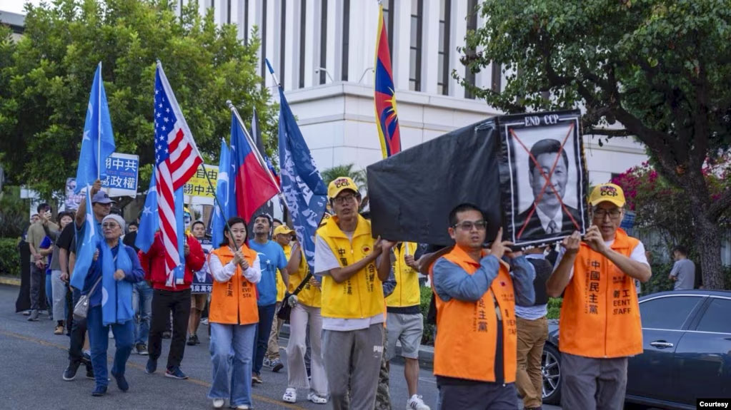 洛杉磯的中國民主黨黨員抬著棺木、放著哀樂繞著中國領事館遊行,為中共送葬。棺木前貼著中華人民共和國主席習近平的遺像。中國民主黨的一個黨員告訴美國之音:“中共殘害壓迫我們已經75年,暴政仍然在進行,是時候結束了。”