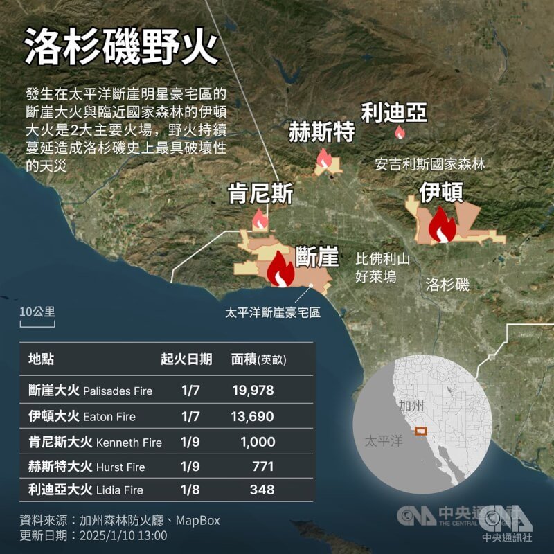 洛杉磯太平洋斷崖(Pacific Palisades)及艾塔迪那(Altadena)地區的大火吞噬約1萬4164公頃土地,摧毀數以千計建築物,已造成11人死亡。