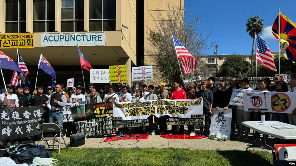 洛杉磯— 香港民主人士和中國異議人士3月23日星期六在中國駐洛杉磯總領館門前舉行了一場聲勢浩大的集會,在香港「23條」立法生效之際抗議該法的通過和實施。近200名參與者揮舞標語牌、高喊口號,抗議中共對港人的迫害並強烈要求釋放被拘押的民主人士。