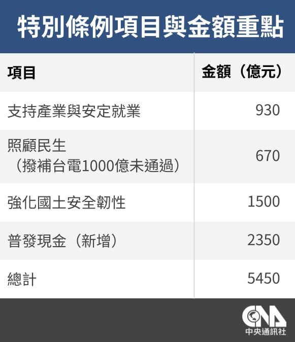(中央社記者郭建伸台北11日電)因應美國對等關稅,立法院會今天上演表決戰並三讀通過特別條例,匡列特別預算上限為新台幣5450億元,並明定每人普發現金1萬元,普發現金定於今年10月31日前完成,但條文未納入撥補台電。