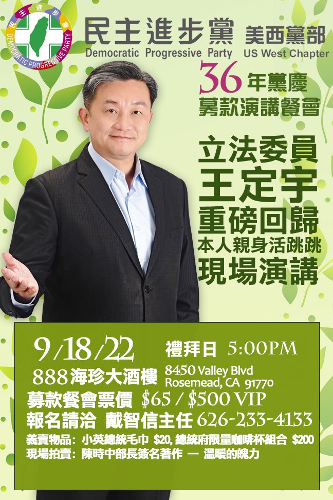 台灣新聞台美人台加人王定宇立法委員9/18應邀來洛杉磯專題演說 August 29, 2022 敬請支持‧歡迎訂閱本報newsletter2022-08-29 民進黨美西黨部因為疫情已經三年沒有來LA的王定宇委員,這次要來現場演講了哦!民進黨美西黨部竭誠邀請您參與今年36年黨慶募款餐會,9/18禮拜天暗時五點在888海珍大酒樓,王定宇委員將為您帶來台灣目前最新的訊息,台美和國際關係的發展,並且Q&A讓大家問到飽。現場並有小英總統周邊產品義賣,也有陳時中部長簽名著作拍賣哦!趕快打電話跟戴智信主任登記報名 626-233-4133 本報24/7隨時更新 歡迎定閱newsletter