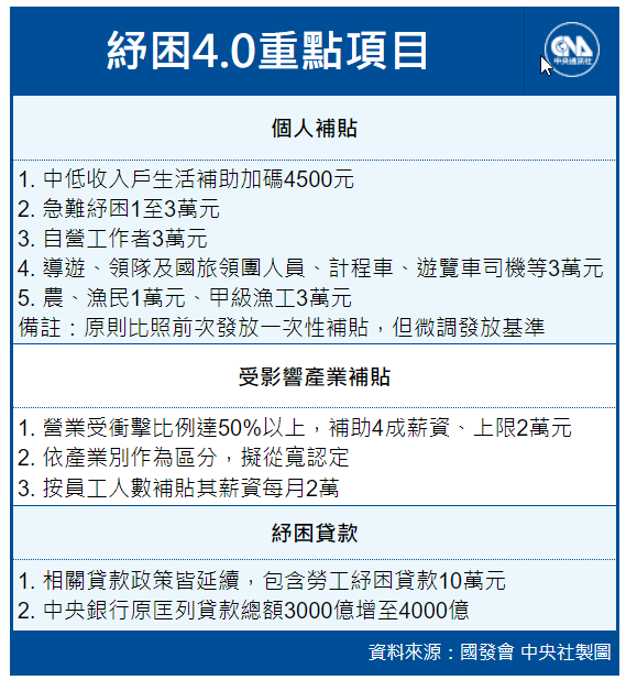 行政院5月29日召開紓困發放以及貸款流程前置作業討論會議,行政院官員表示,首波紓困4.0預算案最多將達2600億元。