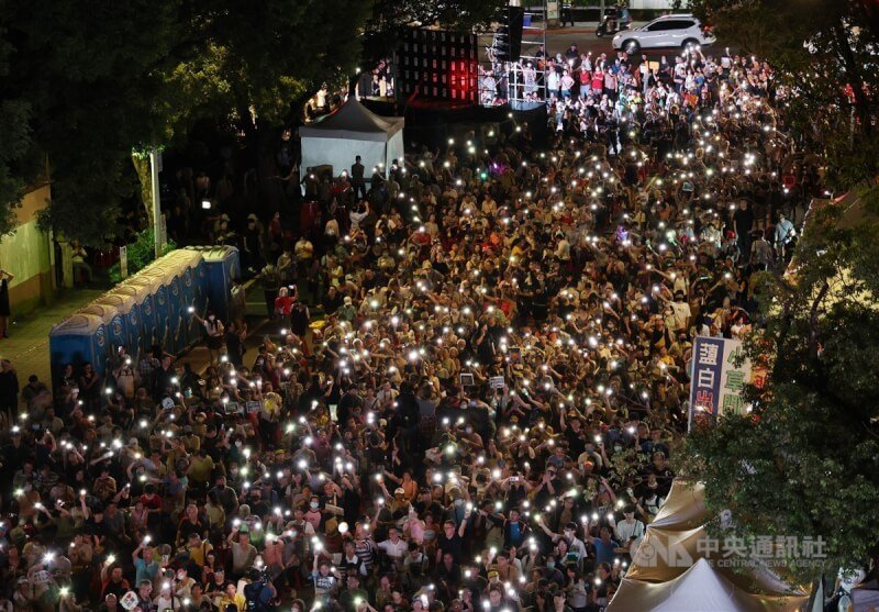 立法院21日否決國會職權修法覆議案,在立院外集結參與「青鳥行動」的民眾晚間仍未散去,許多人點亮手機燈光,配合舞台演出輕輕擺動,打造出一片燈海。中央社記者張新偉攝 113年6月21日
