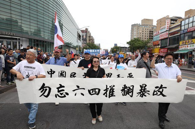 6月2日下午,大批中國民運人士在紐約市皇后區的法拉盛舉行集會,參與者高舉 “勿忘六四推翻暴政”、“中國民主世界和平”等橫幅,以實際行動展現他們 “不忘六四”的精神。