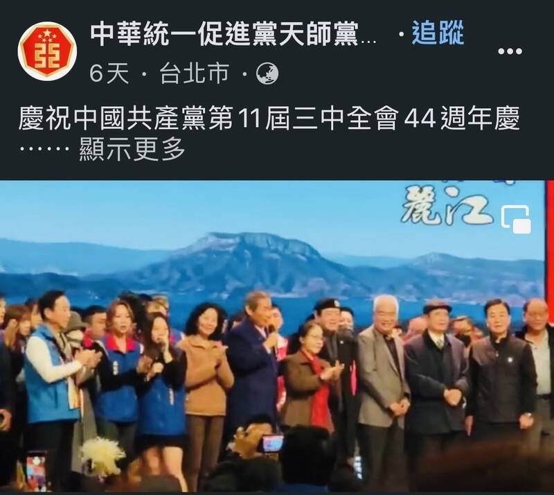 國民黨黃復興黨部主委季麟連(前排右四)上週參加統促黨舉辦的「歡慶中國共產黨第11屆三中全會44週年」活動,與統促黨總裁張安樂在台上同樂唱歌。(翻攝臉書影片)