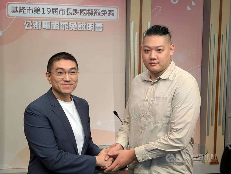 罷免案公辦電視說明會7日晚間舉行,謝國樑與罷免案領銜人戴璟安(右)在說明會開始前於攝影棚內握手致意。中央社記者王朝鈺攝-113年10月7日.jpg)