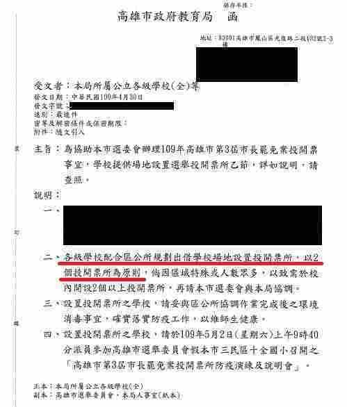 3、投票所設置於機關、學校,係公職人員選舉罷免法第57條所明定,攸關憲法賦予人民參政權行使,與會多數區公所均表示有於校內設置2個以上投票所必要,請高市教育局依今天會議決議及高市府4月30日函示,在5月4日前轉知各級學校同意出借場地作為投開票所,並副知高雄市選舉委員會。