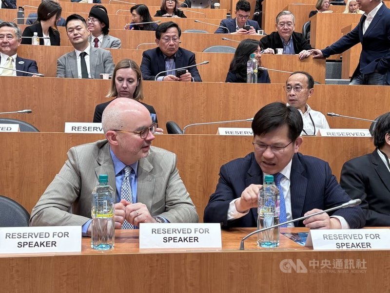 23日與美國在台協會處長谷立言(Raymond-Greene)(前左)共同出席美國史丹佛大學舒思深亞太研究中心在台北舉辦的論壇。中央社.jpg)