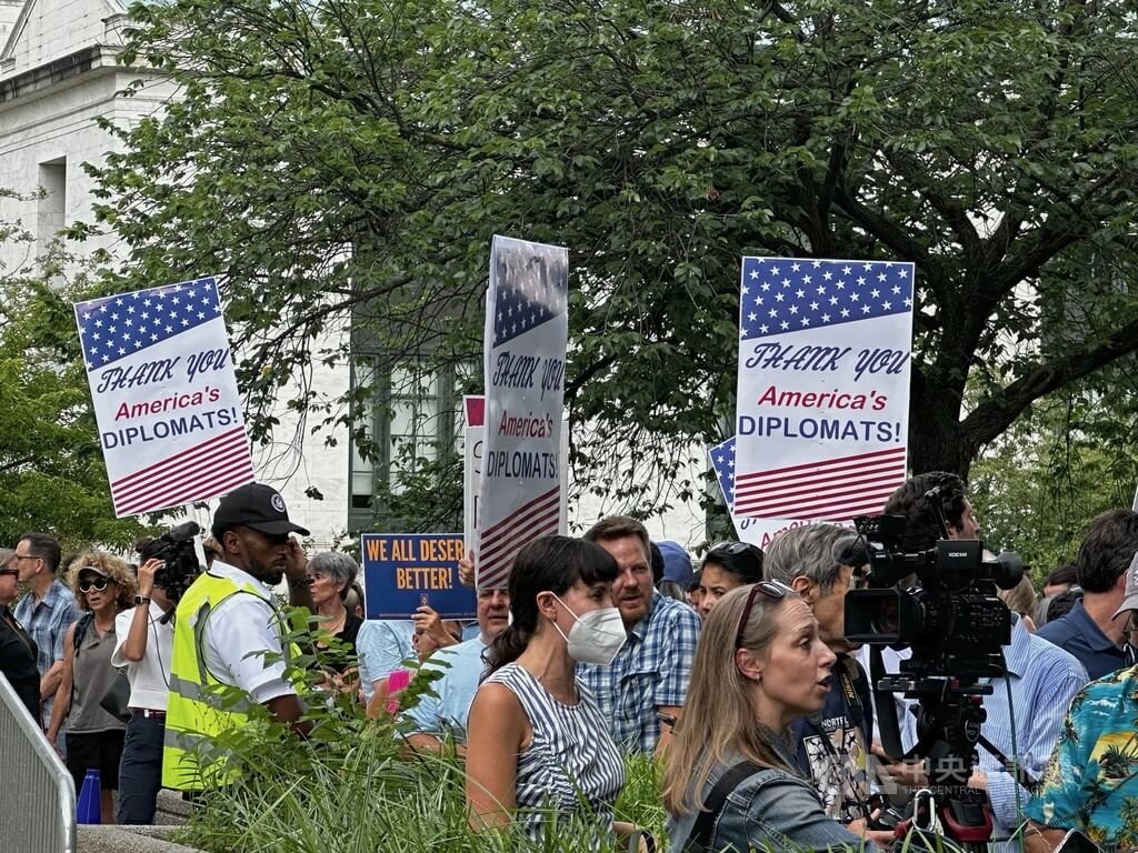 為聲援被裁的國務院人員,今天下午約有數十名民眾站在國務院大門口,附近還有不少人舉著寫有「謝謝你,美國外交官」的標語,每當有被裁員工走出大門,全場就會響起熱烈掌聲。許多人被迫離開工作多年的職場不禁頻頻拭淚,一名曾派駐台灣的美國外交官因情緒激動而婉拒接受記者採訪,她與在場友人擁抱告別後,含淚離開工作20年的職場。