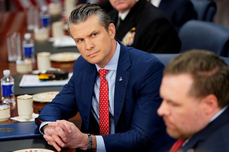 美國國防部長赫格塞斯(Pete Hegseth)(後)因大西洋月刊總編Jeffrey Goldberg「被誤入」國安群組遭議員怒批無能。(路透社)