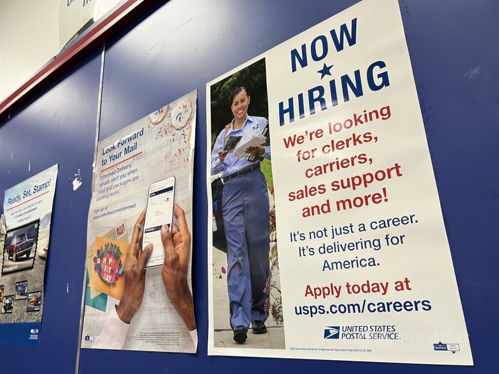 美政府將再度停擺,專家評估,可能對就業情勢產生更長遠的影響,也為經濟投入不確定性。圖為紐約一間郵局張貼徵才告示。(中央社檔案照片)