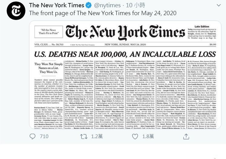 法新社報導,紐時在頭版以「美國死亡人數逼近10萬,無法計算的損失」為題,全版刊出1000名染疫死者的訃聞,列出其姓名、年齡及簡介致哀。