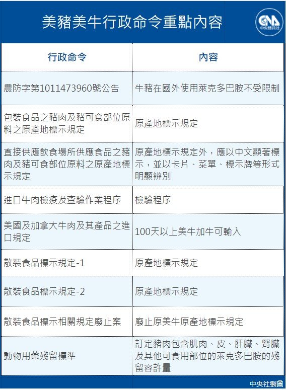 立法院會今天處理報告事項,其中有關進口含萊劑美豬、30月齡以上美牛的9項行政命令,原本僅需交付相關委員會備查;但朝野黨團今天提案要求,將行政命令改交付經濟、衛環委員會等5個委員會聯席審查。