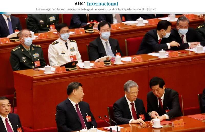 ABC西班牙語記者PABLO M. DÍEZ 拍到胡錦濤被架出場前的4張照片,依照時間序顯示胡想要翻開自己的文件夾,被鄰座的栗戰書出手制止;第2張照片顯示栗戰書壓住胡的手,栗想拿走胡的文件夾,胡不願意。