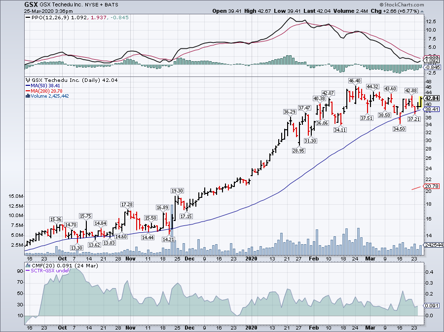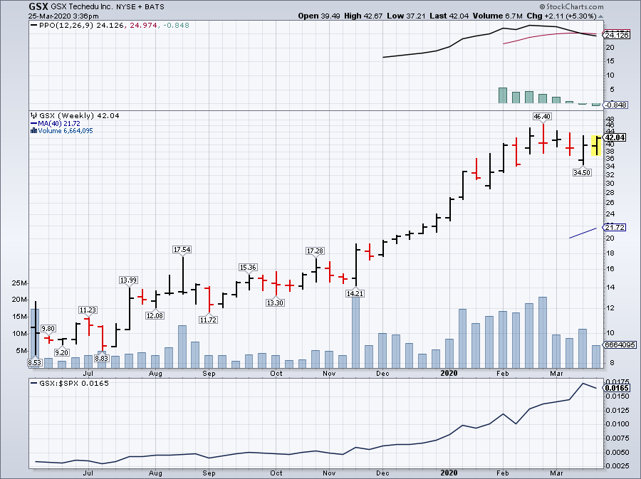 現在購買的話比較冒險,多些不確定性,因為往後之日,可能發生什麼不可知的狀況,不保險。根據IBD 的作法,要等,確實看到它「突破」買點,並且有巨大交易量時,才好。所以讀者務必注意觀察此股,最快,可能下個禮拜會出現「突破」。屆時勿失良機,因為如果突破,這個股可能還會再向上衝刺。GSX 從上市至今,已經增加298%, 如果從今年元旦算,已經增加79%. 這次武漢病毒帶出全球經濟崩盤,死傷慘重,但是這個股,卻一枝獨秀! (扶丁 / 3/24//20)