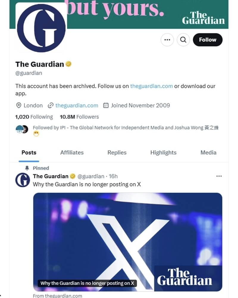 「衛報」在其網站發表的社論中表示:「我們認為,出現在X上的好處現在已被負面因素抵銷,資源可以更好地運用在其他地方推廣我們的新聞事業。」