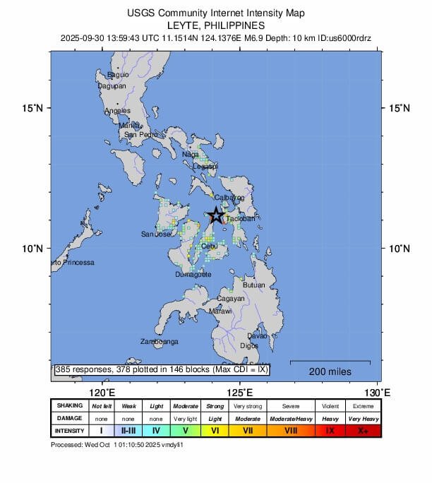 美國地質調查所(USGS)表示,這起淺層地震發生在昨天晚間9時50分,震央在宿霧島北部博哥市(Bogo)外海。博哥市人口約9萬。