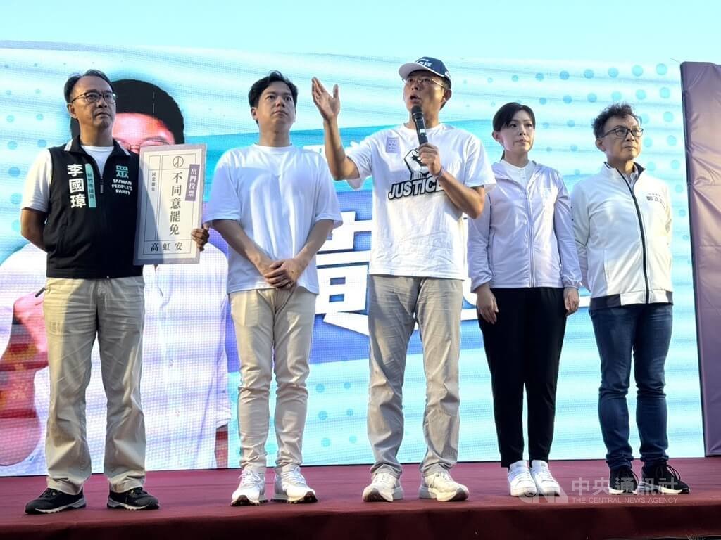 民眾黨下午在台鐵新竹站前廣場舉辦「安定新竹、罷免投不」宣講活動,黃國昌、高虹安及鄭正鈐出席,現場湧入數百名支持者,多名新竹市里長也到場聲援。