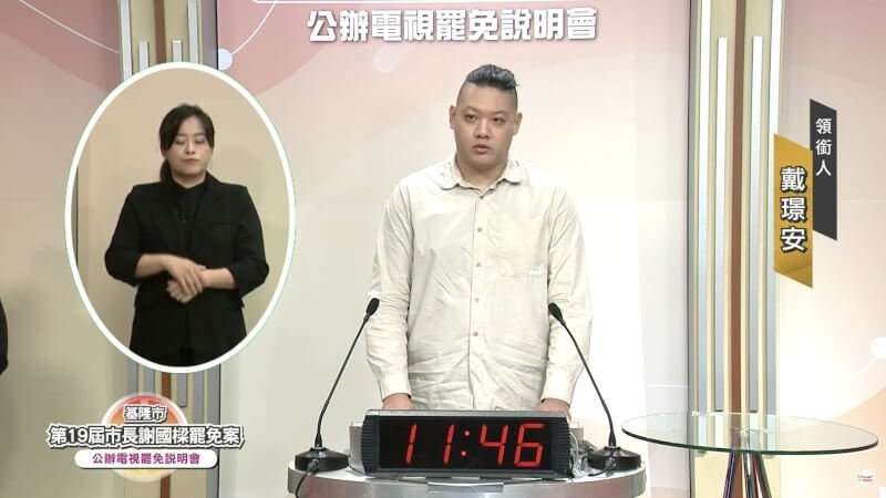 基隆市長謝國樑罷免案公辦電視說明會7日晚間7時舉行,領銜人戴璟安(中)上台說明。(圖取自中嘉新聞YouTube頻道youtube.com)