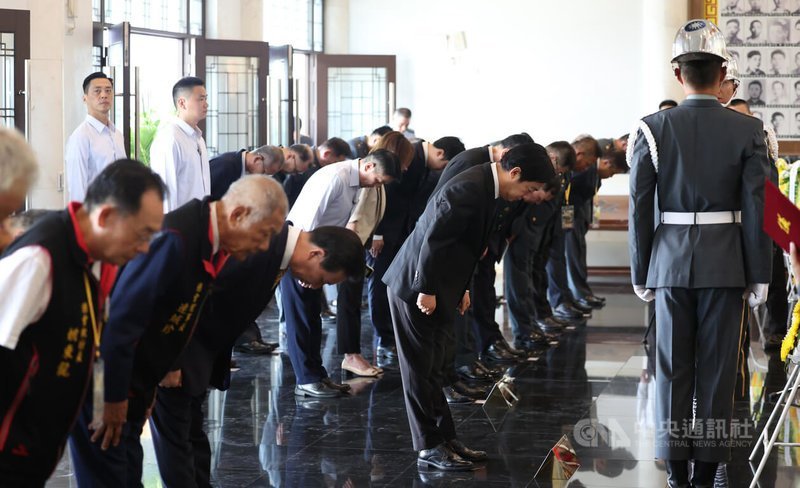 總統賴清德(前中)23日上午在金門太武山公墓忠烈殿主持「823戰役勝利66週年追悼典禮」,向英勇殉國的將士們鞠躬致敬。中央社記者張新偉攝 113年8月23日
