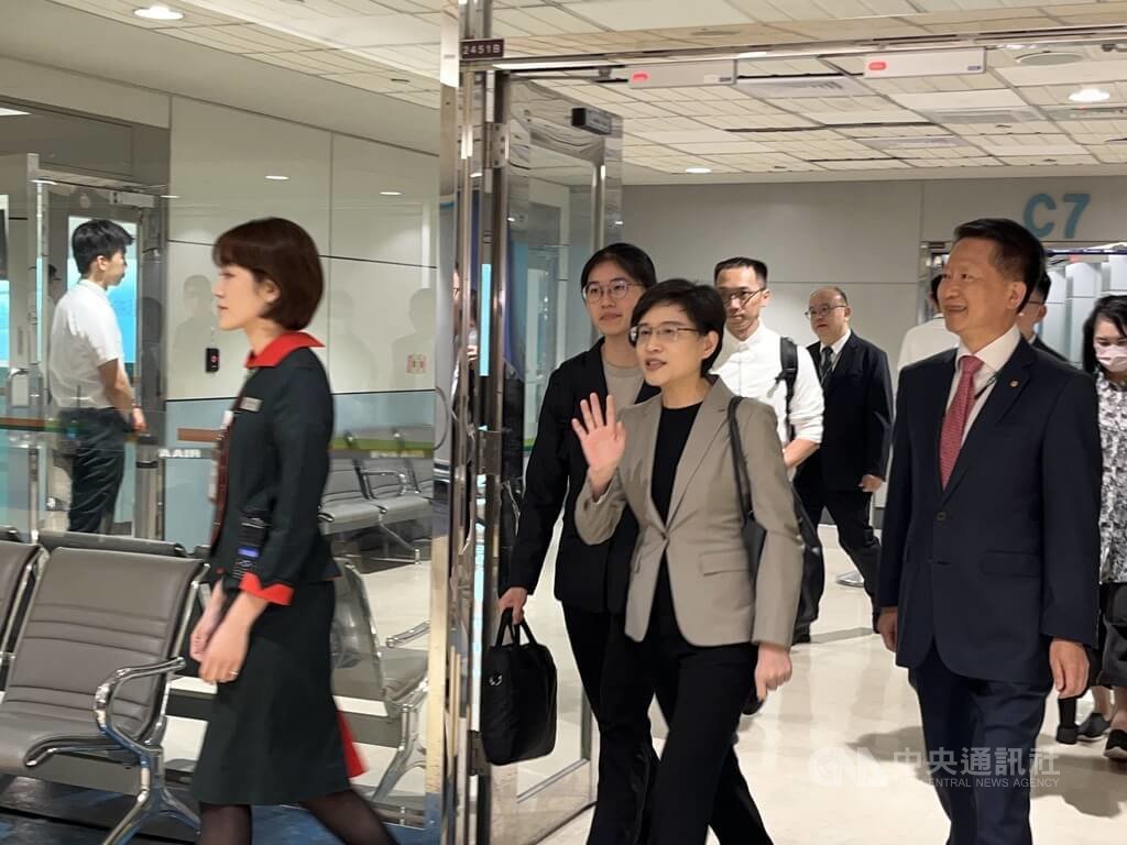 各界關注台灣對等關稅新稅率,負責對美談判的行政院副院長鄭麗君(揮手者)12日清晨返抵台灣。中央社記者葉臻攝 114年7月12日