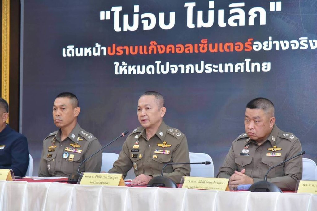 泰國皇家警察科技犯罪中心打擊主任塔猜(Thatchai Pitaneelaboot)(中)21日舉行記者會說明警方日前破獲中國詐騙集團在泰國開設銀行帳戶的案子,警方逮捕多名造假文件協助中國人開戶的銀行行員。(泰警提供)中央社記者呂欣憓曼谷傳真 114年5月21日